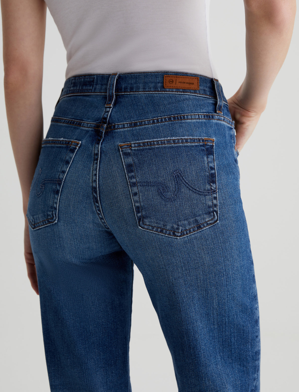 Brinley is our new mid-rise straight jean, done here in a dark blue wash with marigold contrast stitching and a 15-year AG-ed™ finish. Fading, whiskering, and hits of distressing near the hems. These five-pocket women's jeans sit right at the natural waist and fall to the perfect straight-leg silhouette for year-round styling. This pair comes in 11 oz. Lead Denim with comfort stretch.