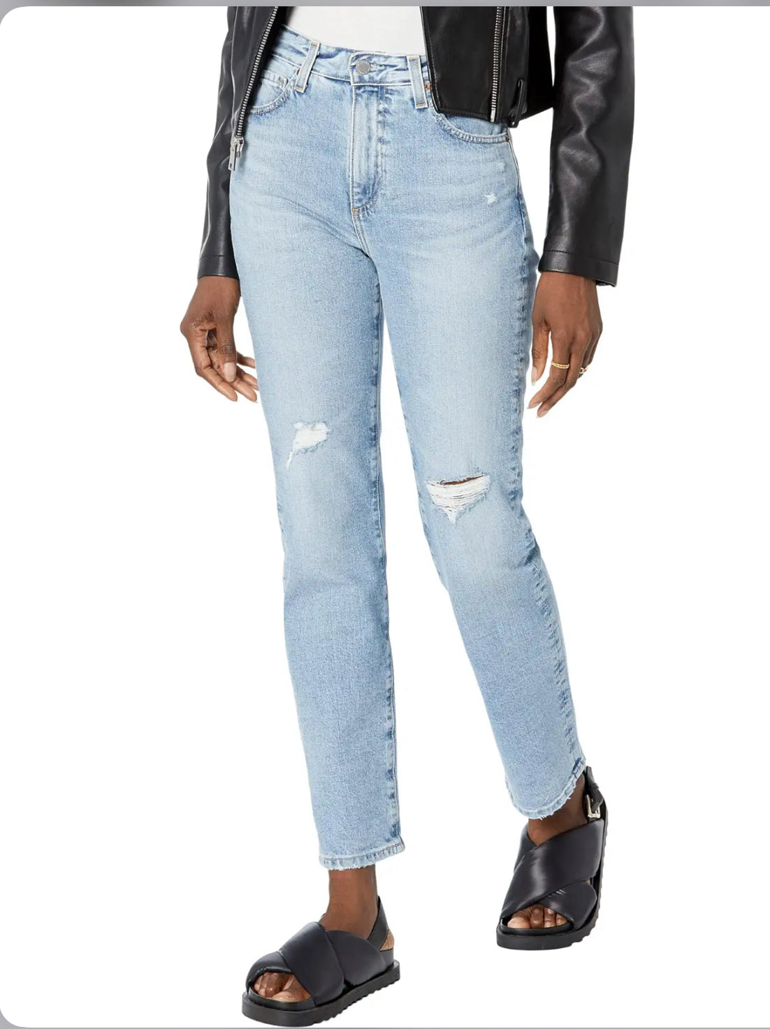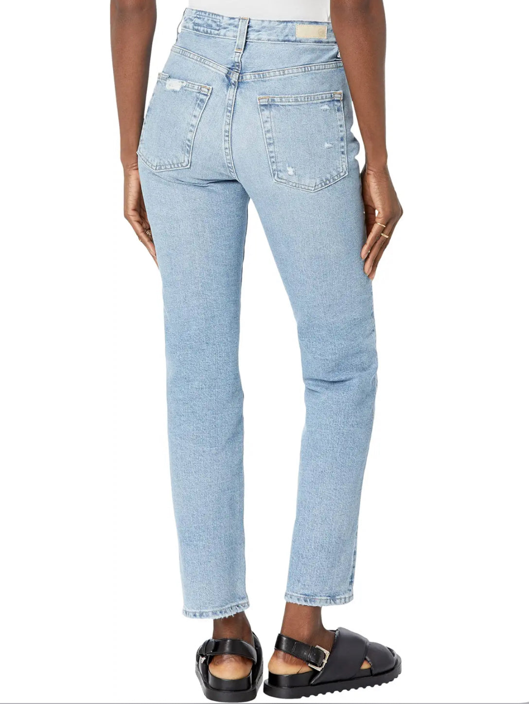 Saige is a women's high-rise straight jean in a faded light blue wash with subtle distressing and a touch of fraying at the hems. These straight-leg jeans are cut from 11 oz. 360° Denim with vintage bi-stretch for a comfortable fit. Saige is complete with a zip fly, angled yoke, and slightly forward side seams.