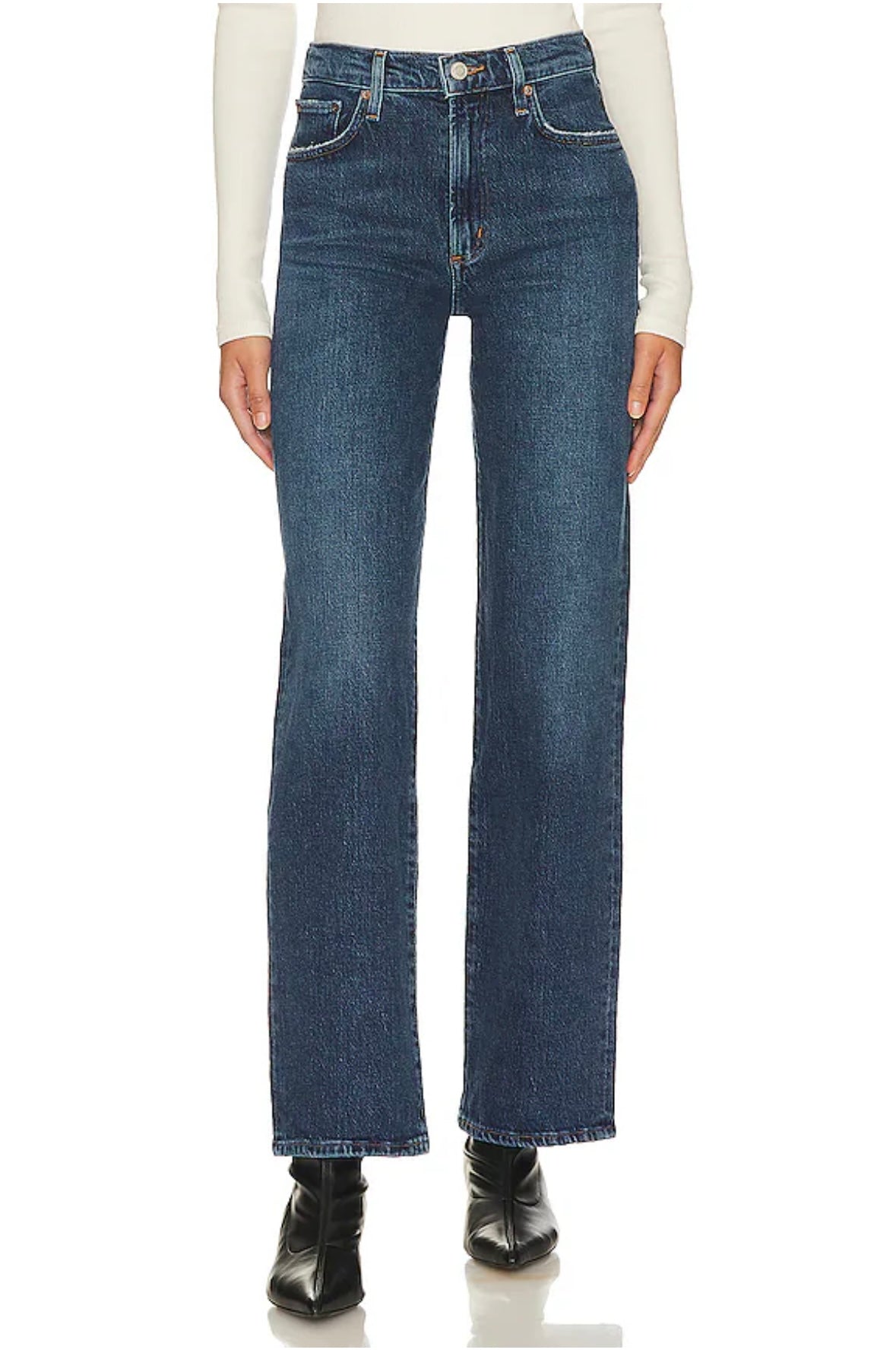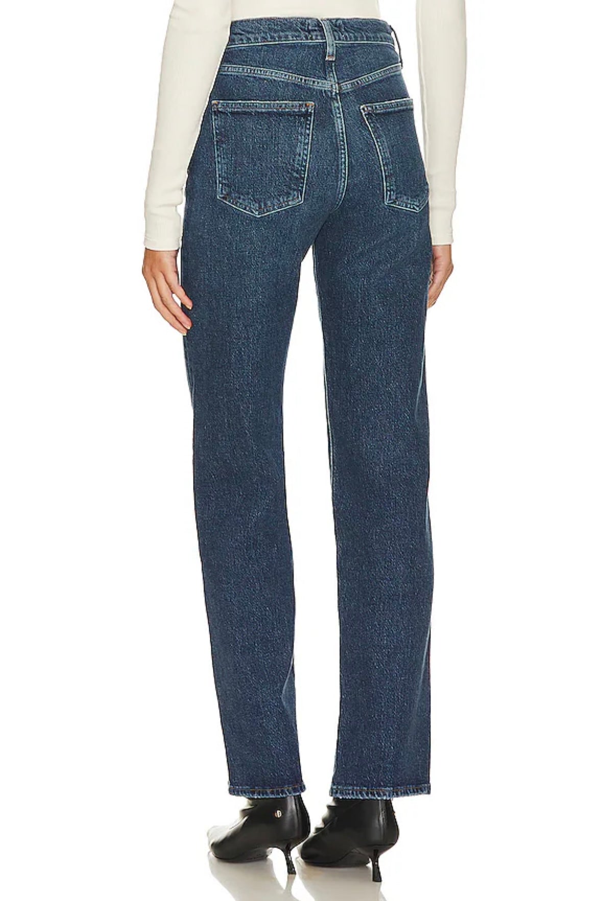 - Discover timeless denim with the "AGOLDE Harper Mid Rise Straight in Tempo." This high-waisted, dark wash jean is a must-have with its classic straight leg silhouette. Crafted from rigid denim and subtly distressed for a touch of character, it offers 5-pocket styling for practicality. Perfect for everyday wear, it's the go-to piece that seamlessly transitions from day to night. Casual at its finest.