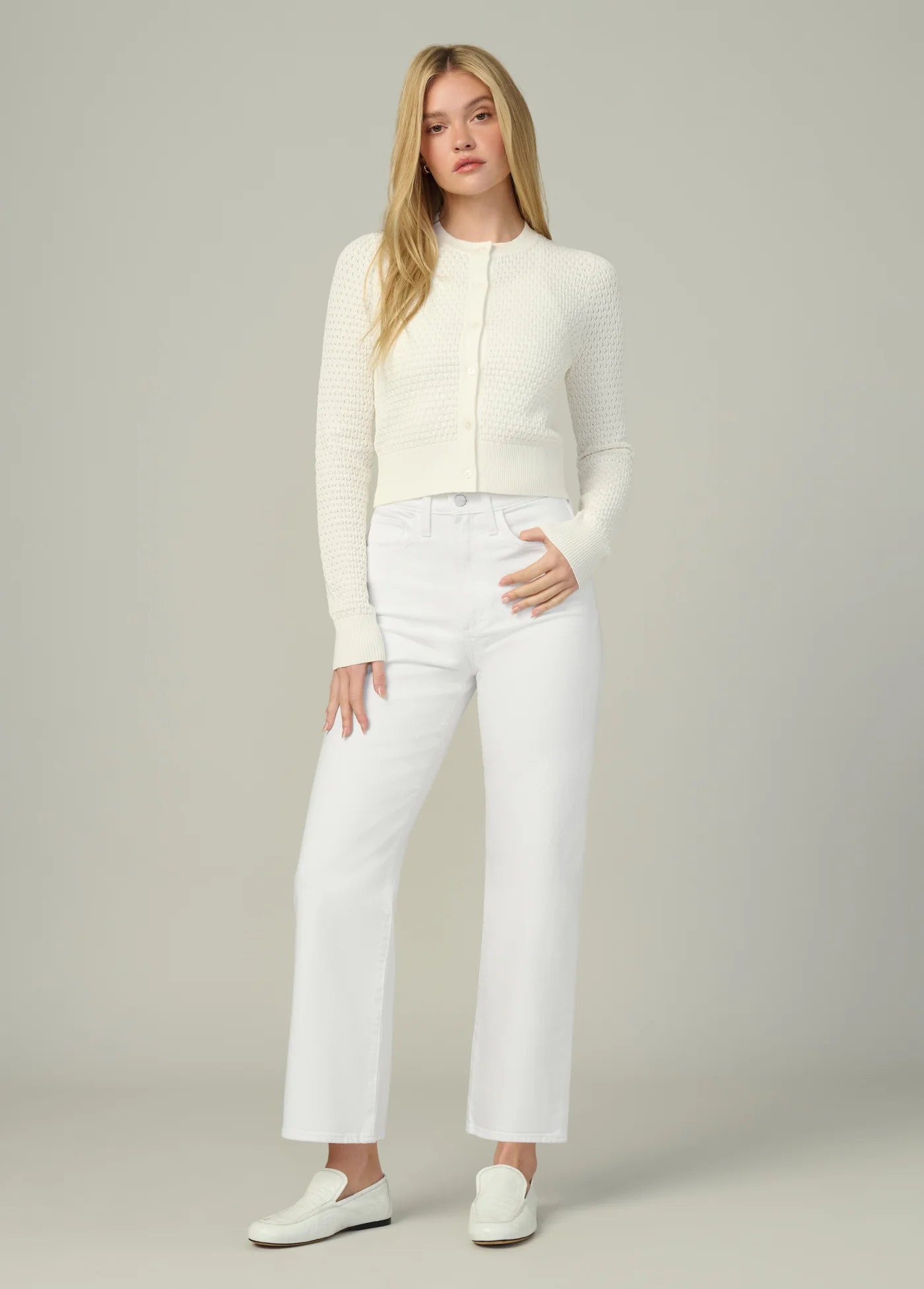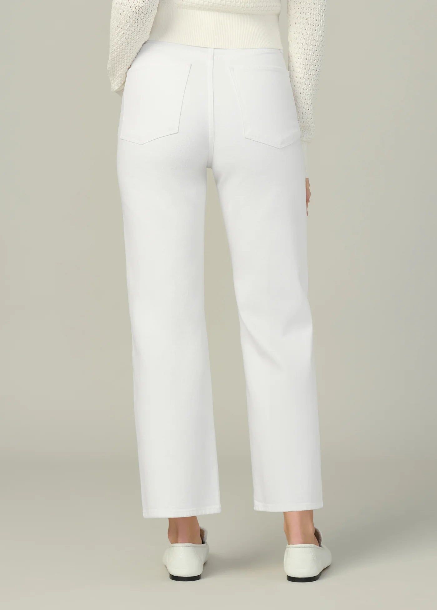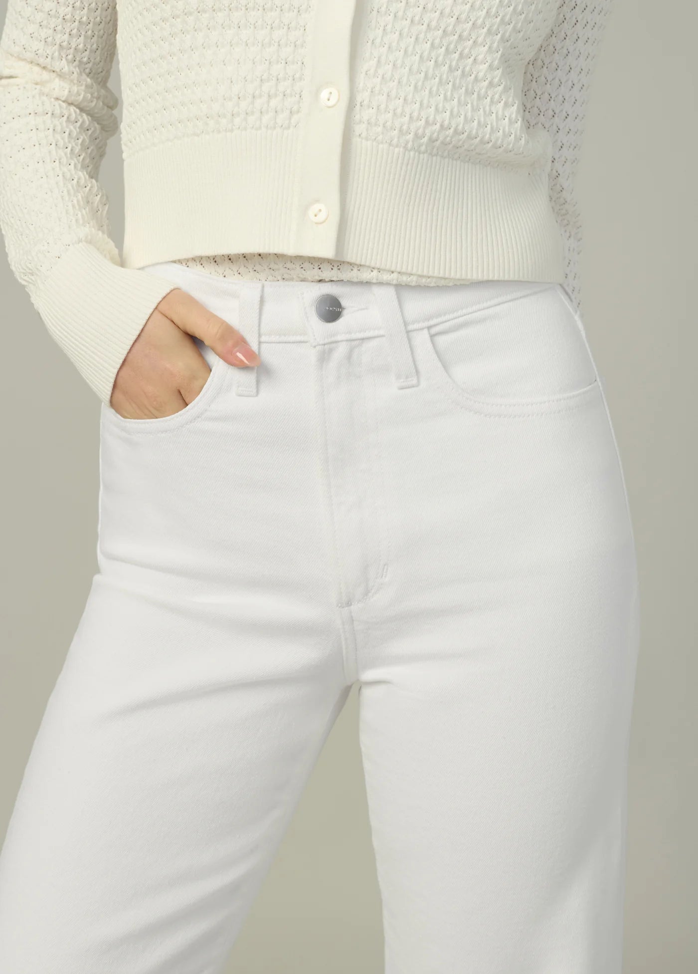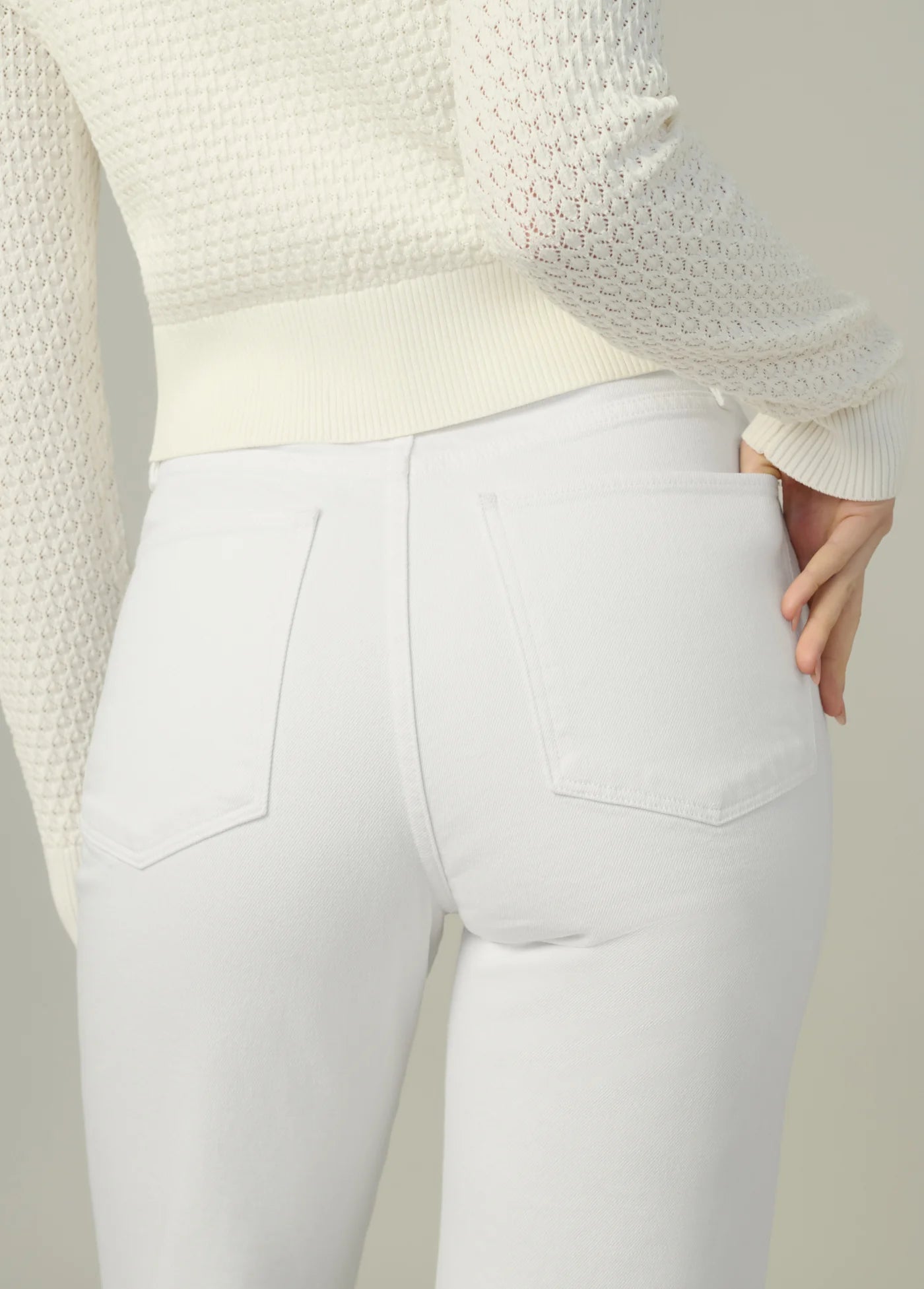 A high rise and slim fit through the waist and hip with a straight leg that hits above the ankle.