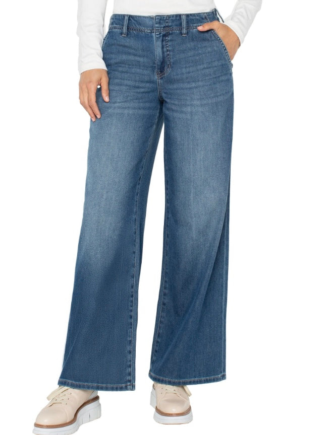 The polished stretch-denim construction lends a distinctive look and texture to these full-length wide-leg jeans that freshen up your off-duty style.