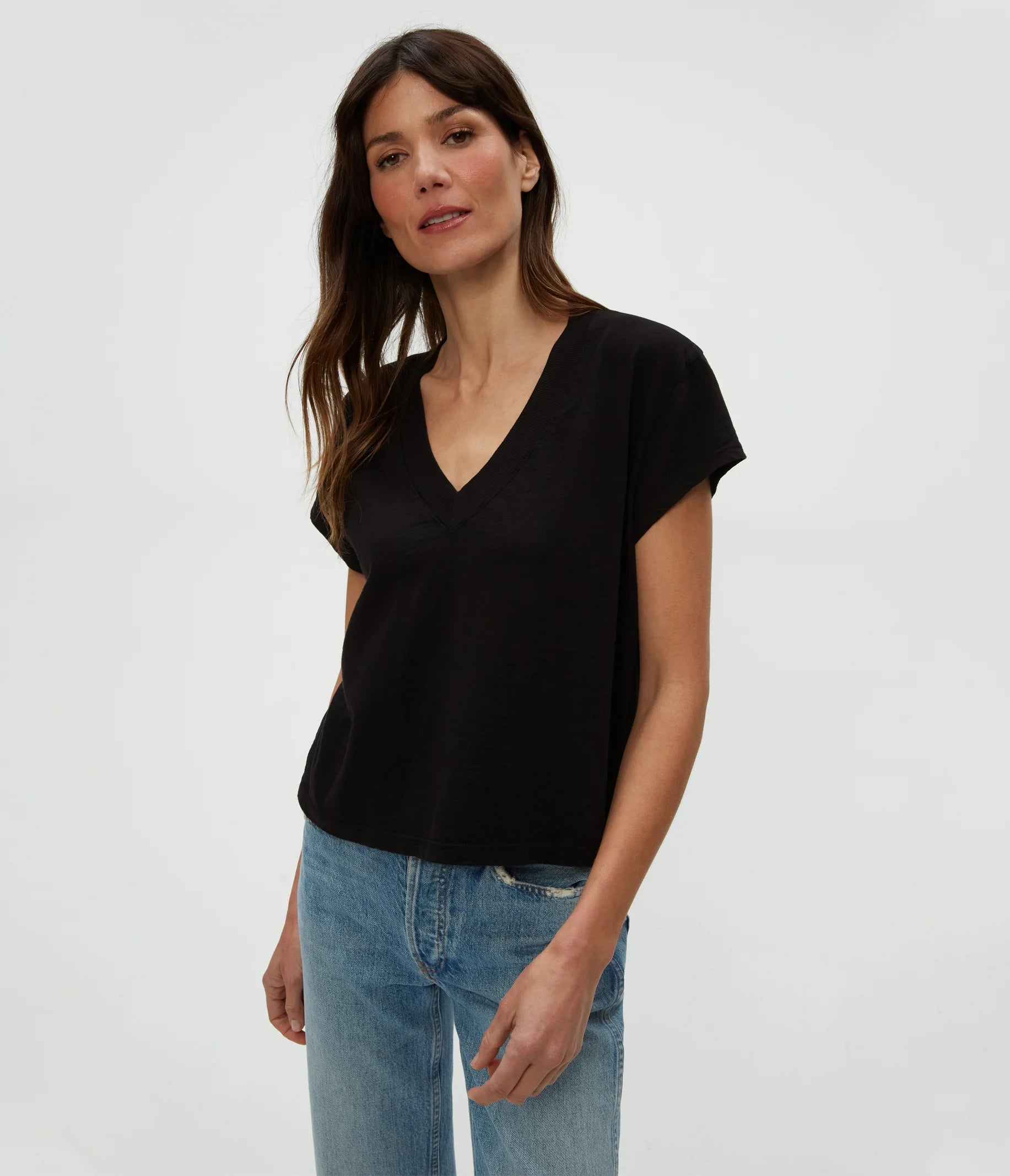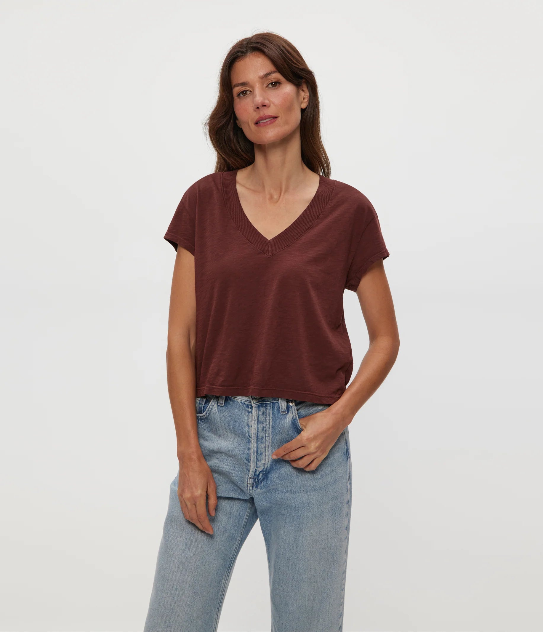 Your day-to-day tee, got a refresh in our beloved SUPIMA® cotton. Offering a more generous fit, this basic has a big personality with a v-neckline complete with a wide-ribbed trim, short sleeves, and a cropped fit that stops just at the top of the waistband. This, wear-with-everything tee, exceeds expectations as a comfortable, but stylish option for every body.