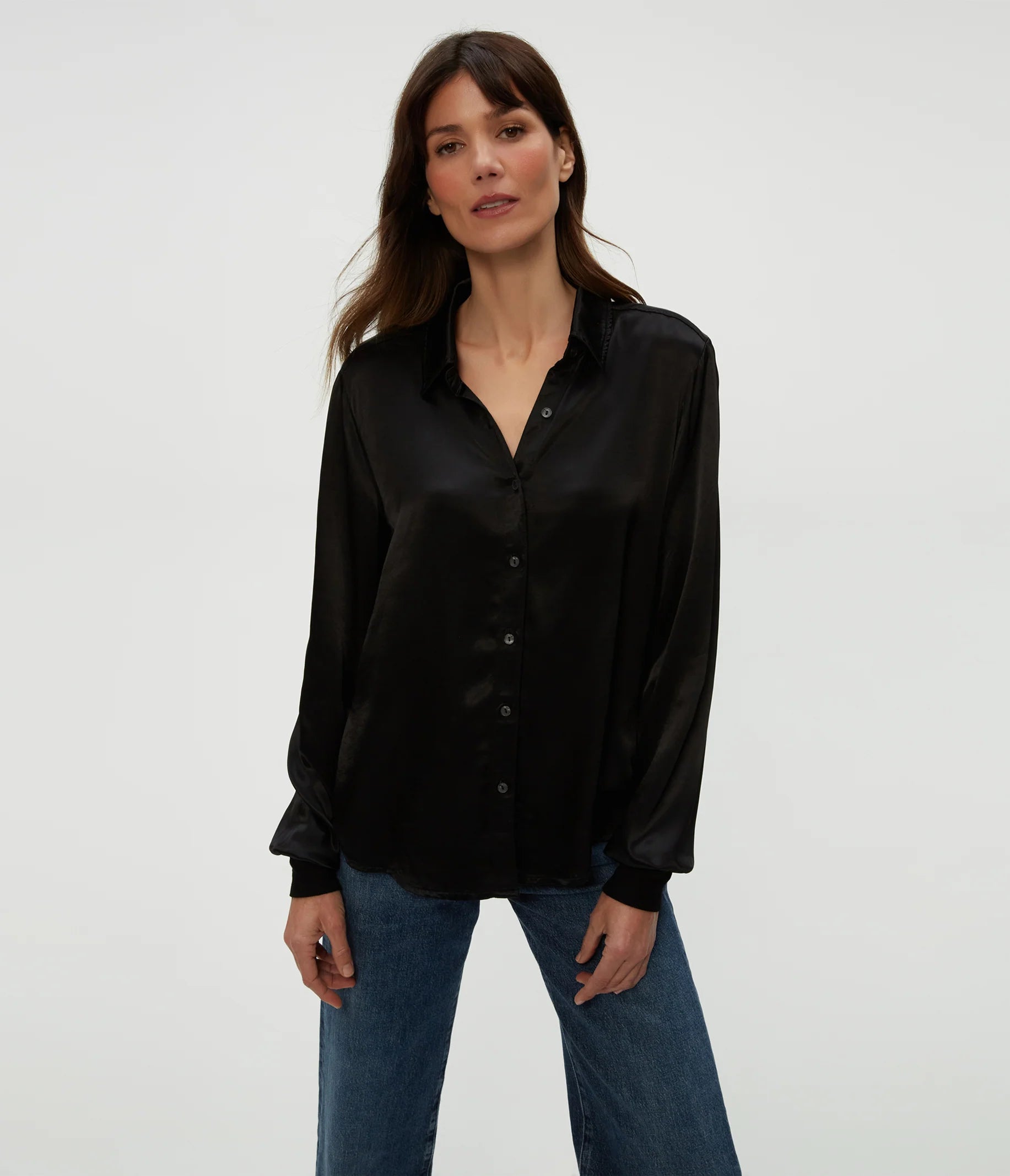 Meredith is an elevated version of the classic button down. Featuring a collar and long sleeves with a ribbed cuff detail, our made-in-LA satin drapes beautifully for a flattering, loose fit.