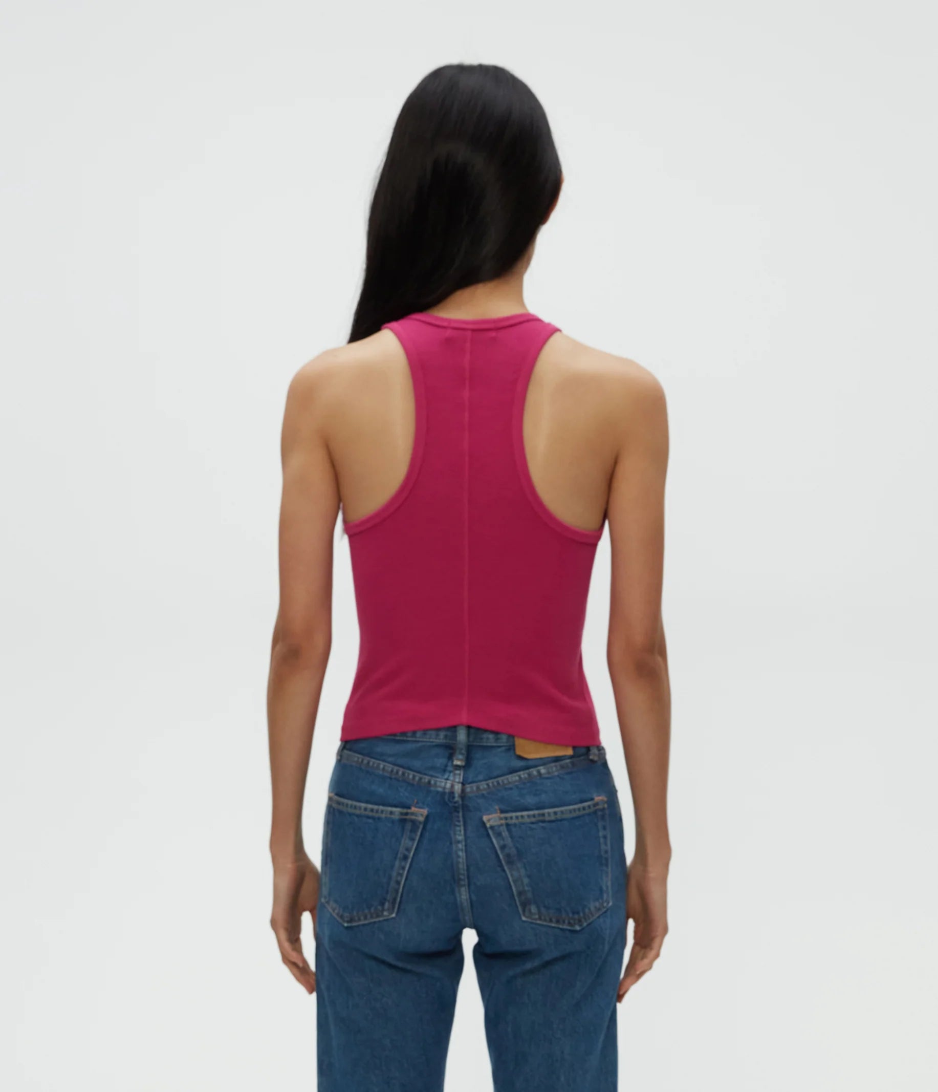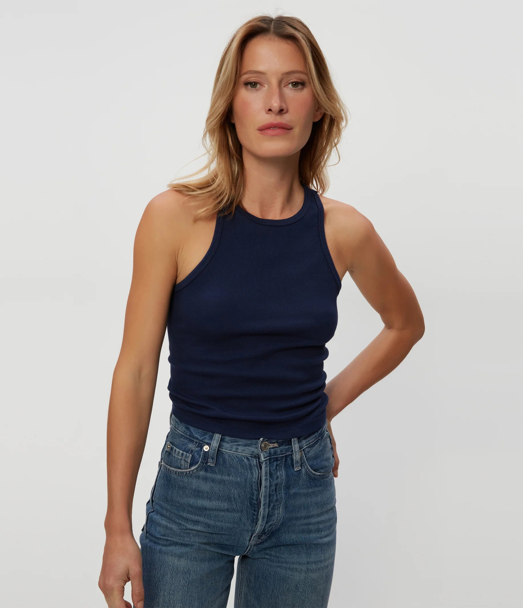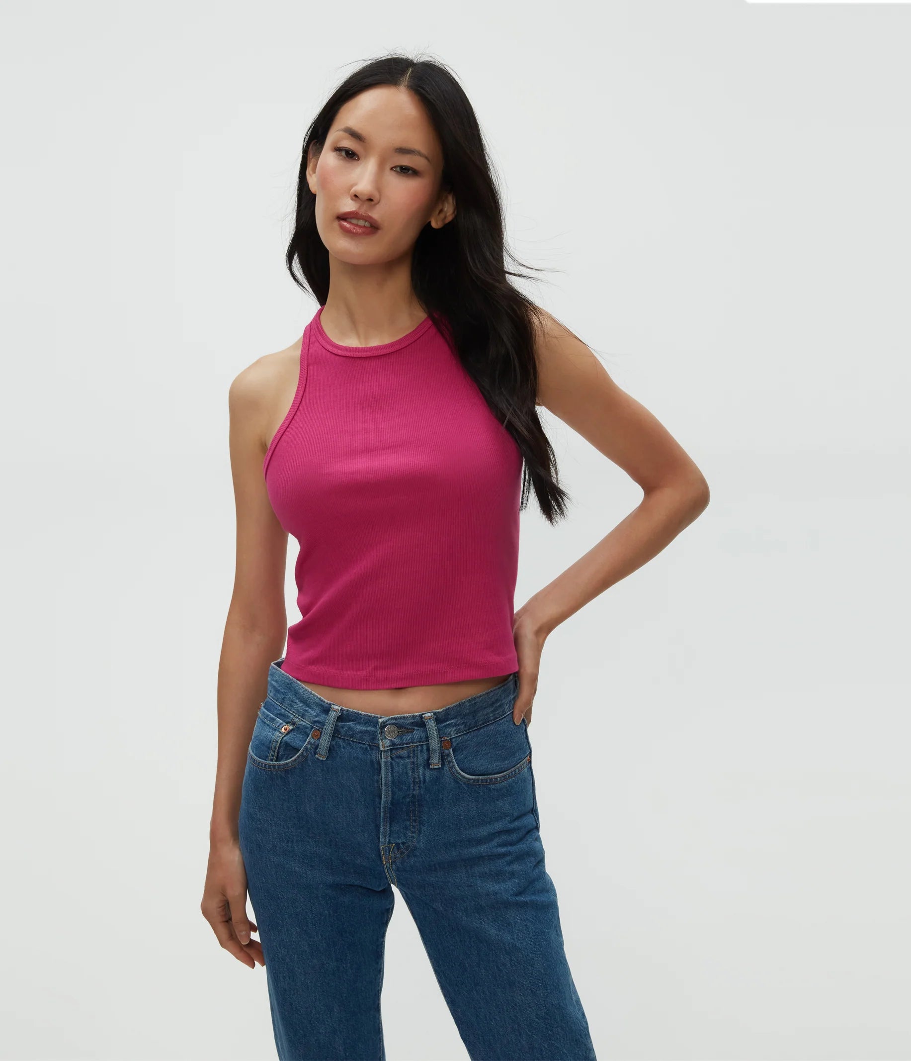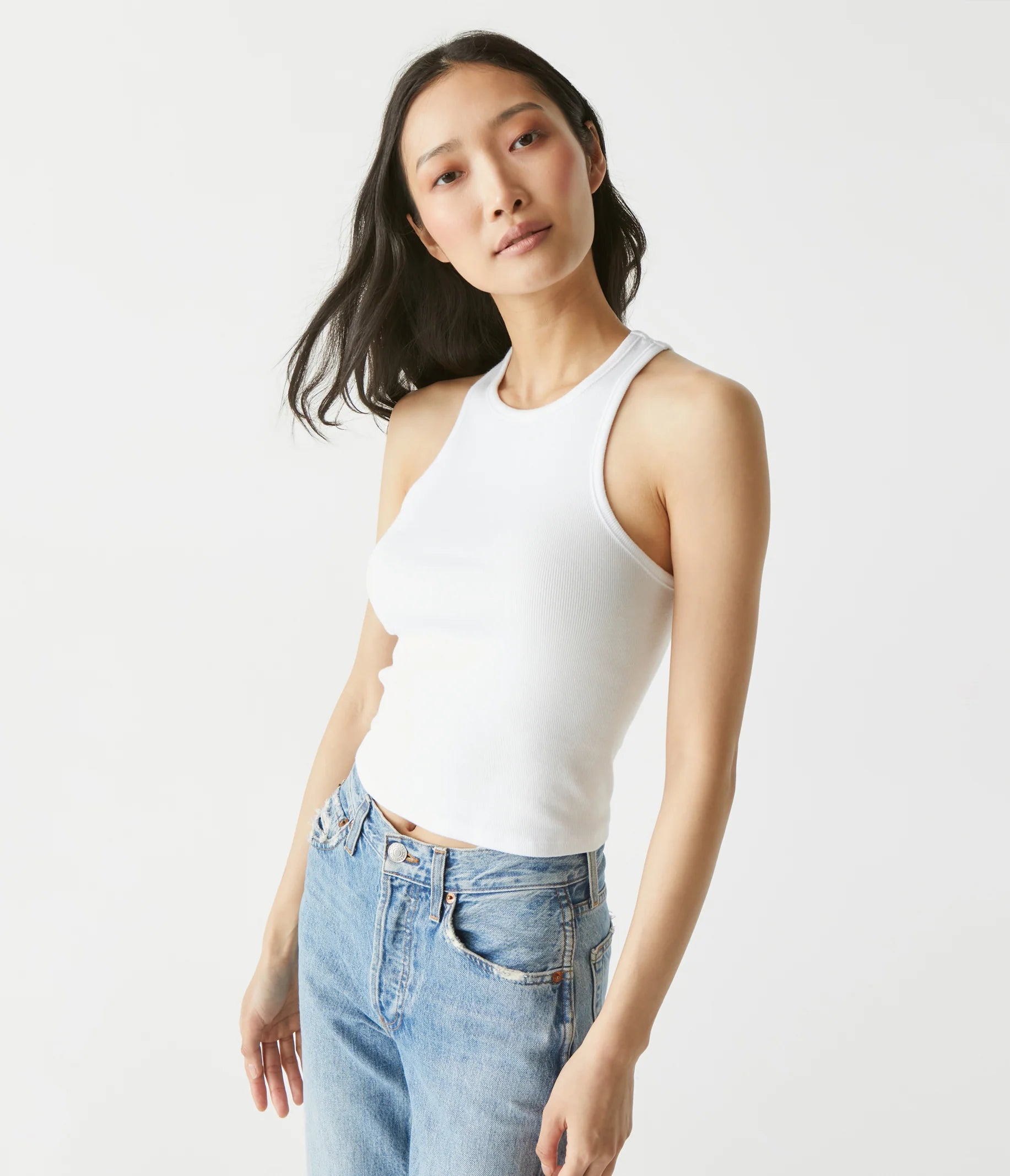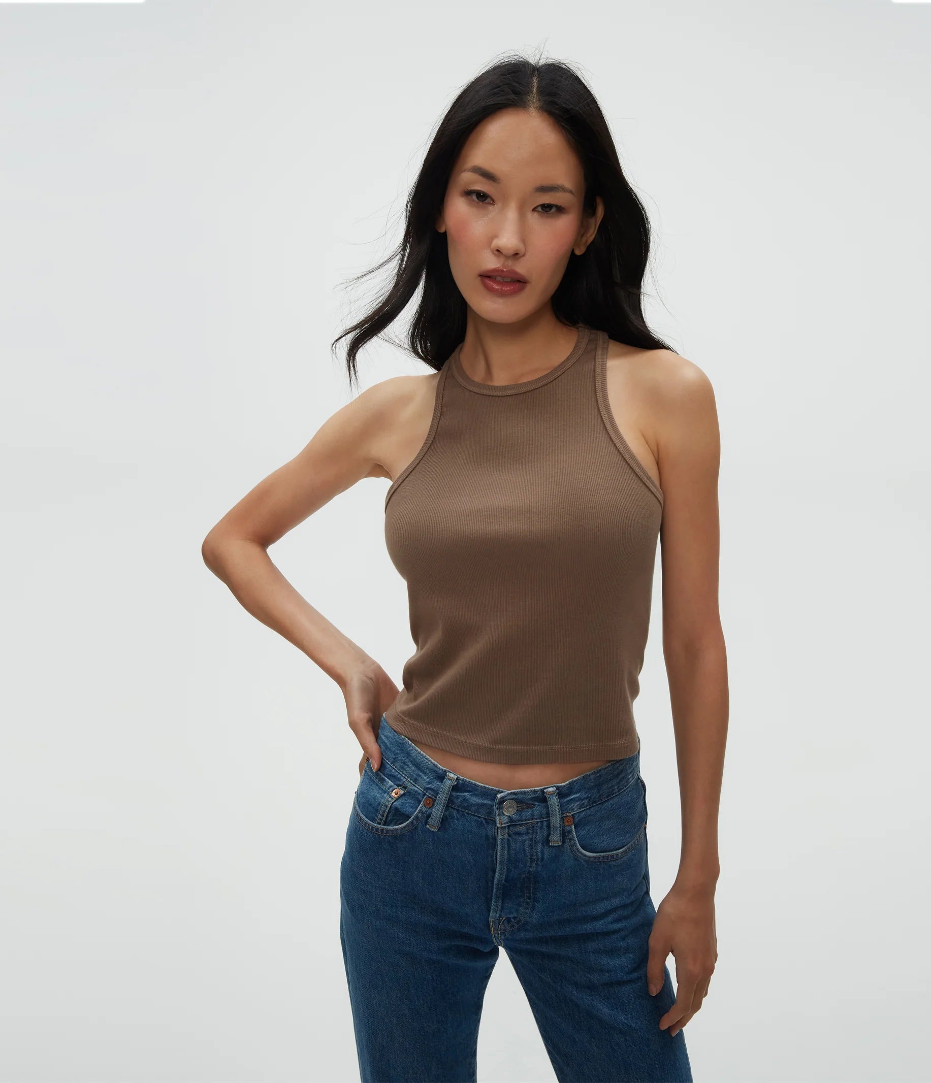 This form-fitting tank features a high crew neck, racerback, cropped waist, and a center back seam. Made from our soft Ultra Rib fabric that washes well and keeps its shape throughout wearing.