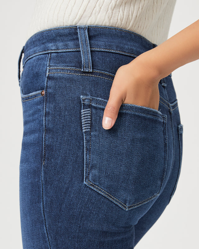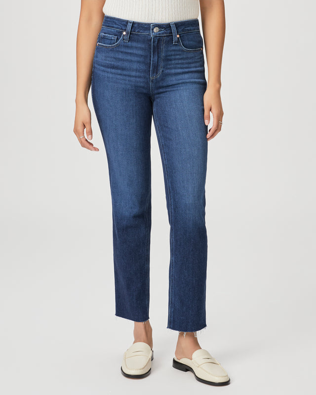 This high-rise, straight jean is lean through the leg and finishes at the ankle with a raw hem. This pair is cut from PAIGE VINTAGE denim in a rich dark wash with natural fading and classic lived-in details. PAIGE VINTAGE takes all of the work out of breaking in your favorite pair of vintage jeans. We've combined the comfort of stretch with everything you love about authentic vintage denim to create super soft jeans that feel perfectly lived-in from the very first wear.