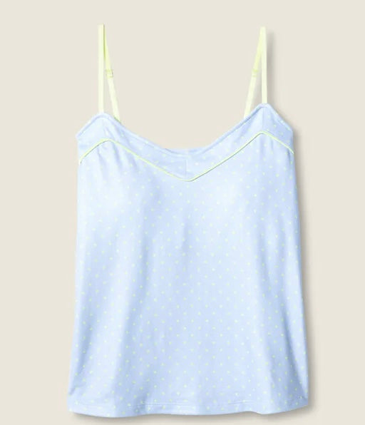 The sweet spot between playful and peaceful. This soft butter jersey PJ set features a light blue base dotted with zesty lime green polka dots. The cami is finished with a piped neckline and adjustable straps, while the relaxed wide-leg pants include a soft elastic waistband, lime drawstring, and punchy side piping. Whether you’re lounging late or easing into the day, it’s an easy favorite—wear it as a set that feels like a breath of fresh air.