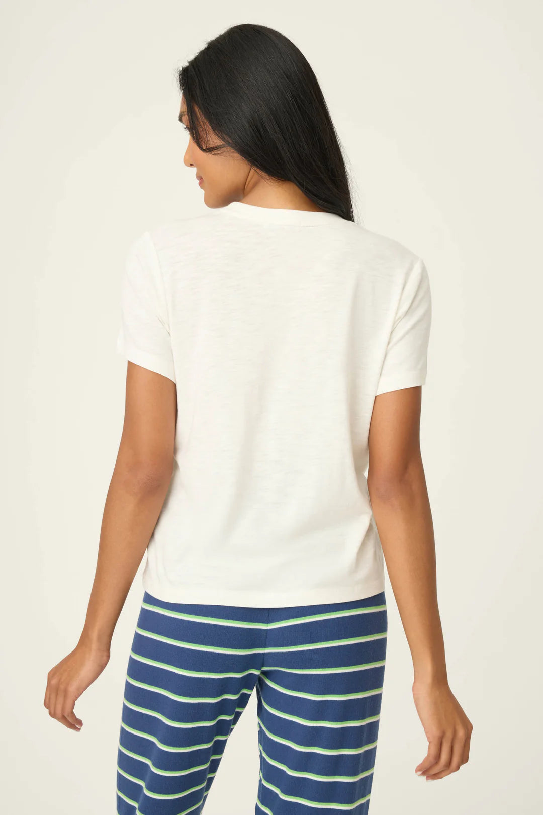 Lightweight and easygoing, this peach jersey graphic tee brings a playful touch to your lounge lineup. Designed in soft ivory with a relaxed silhouette, it features a two-tone “C’est La Vie” graphic in soft green and washed navy. Perfect for pairing with joggers, shorts, or the matching striped bottoms.