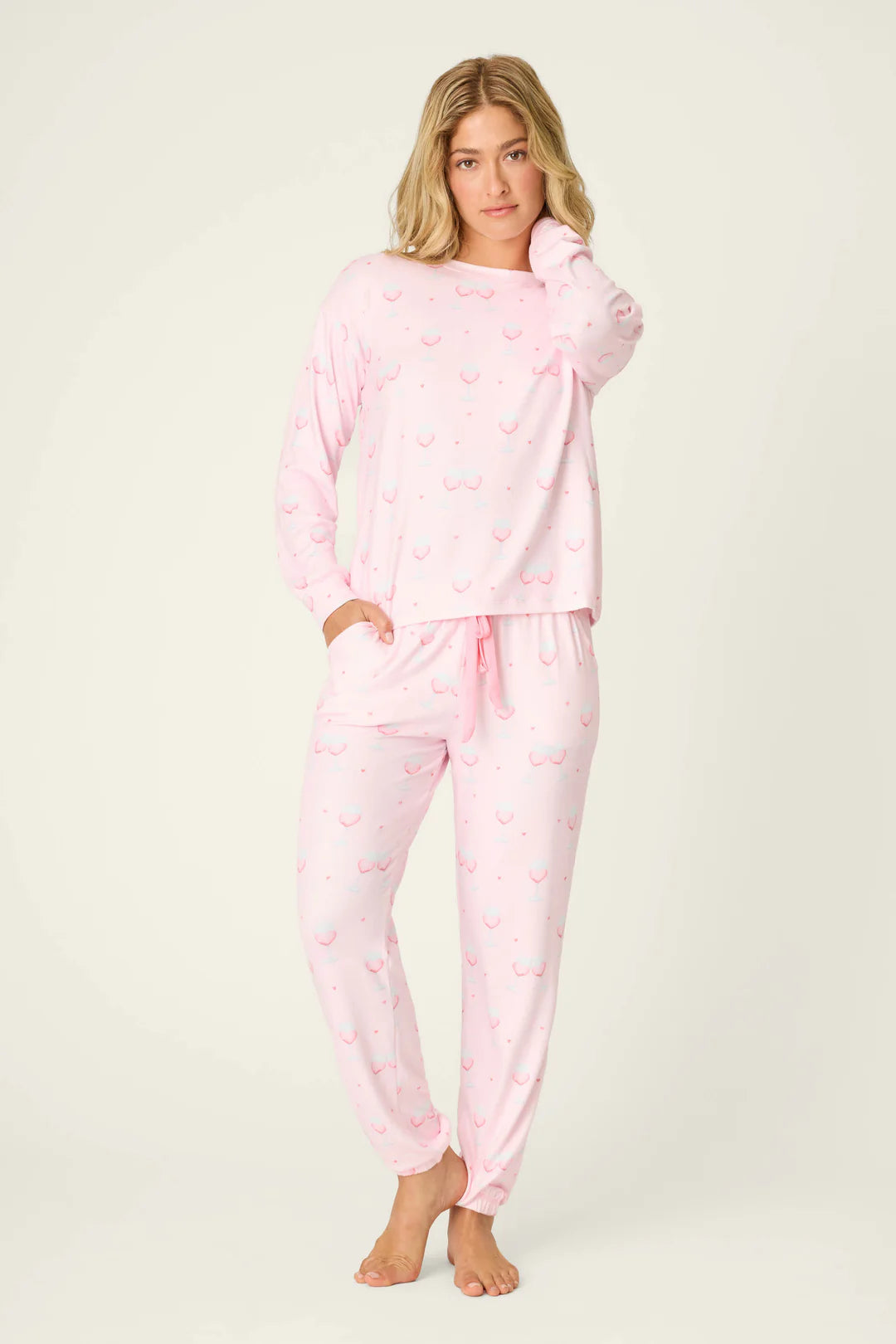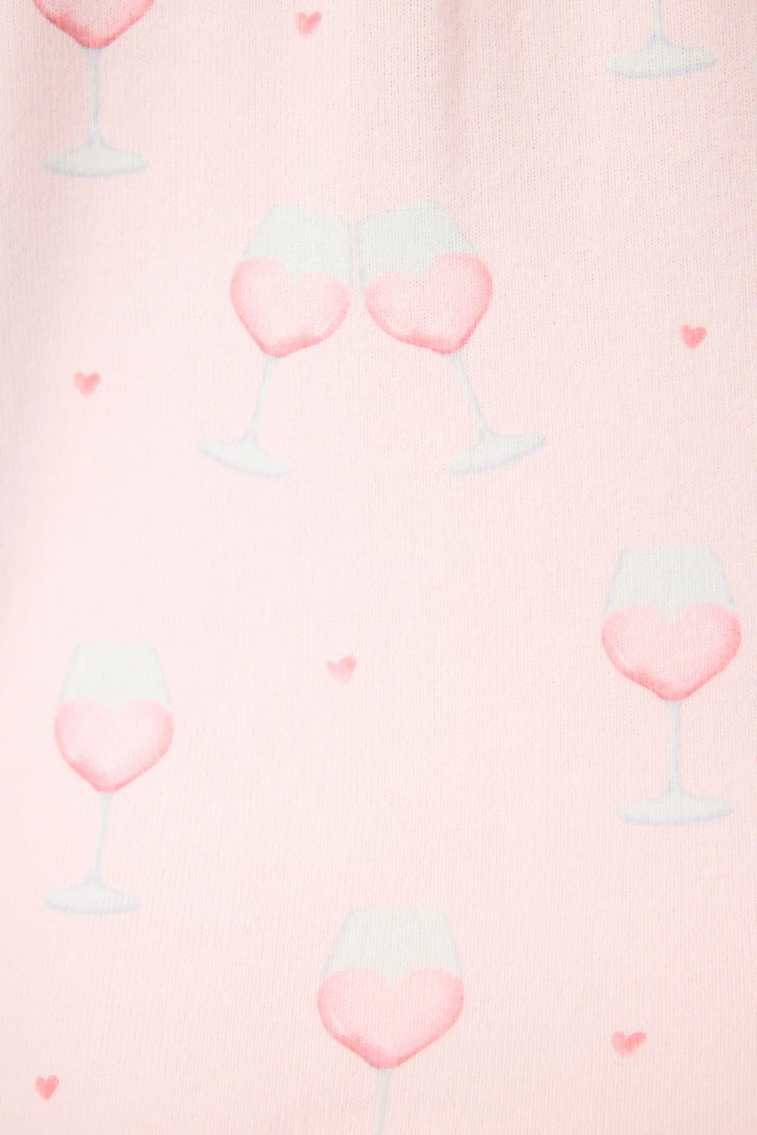 Playful and pretty in light pink, this two-piece pajama set toasts to love, comfort, and cozy nights in. Crafted in ultra-soft butter jersey, it includes a relaxed long-sleeve top and matching banded pants patterned with heart-shaped wine glasses—a sweet, cheeky combo for lounging and unwinding.