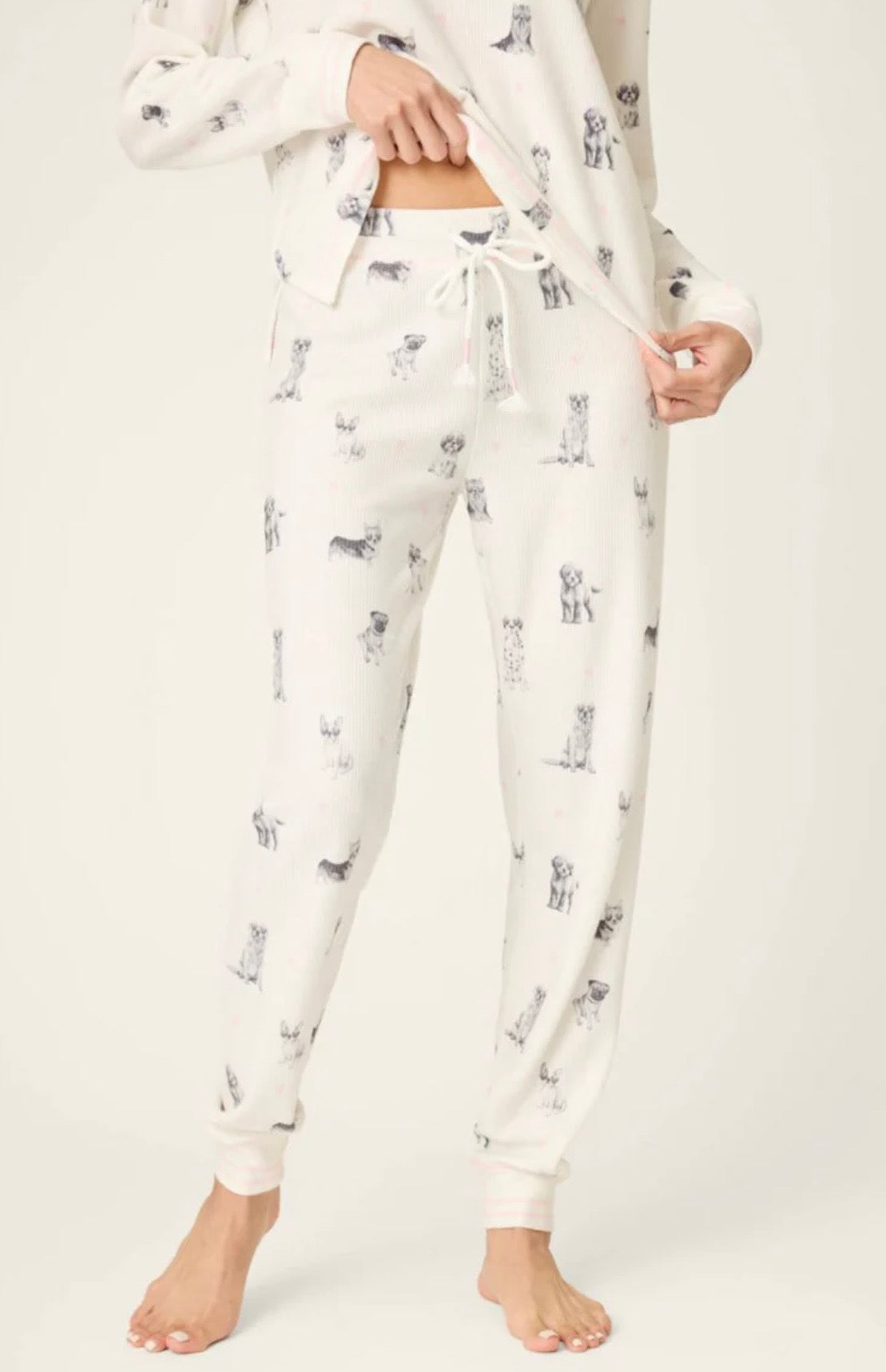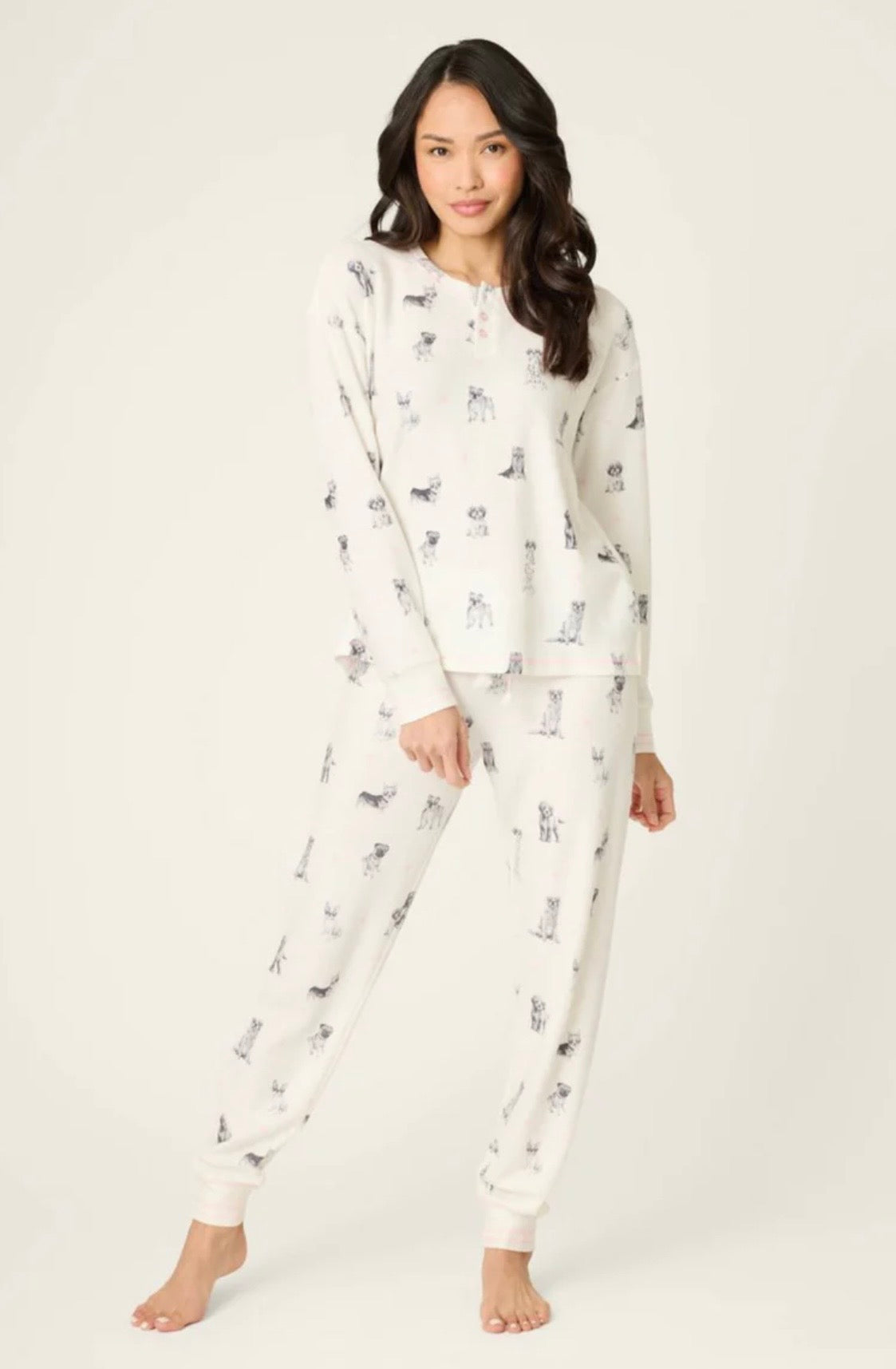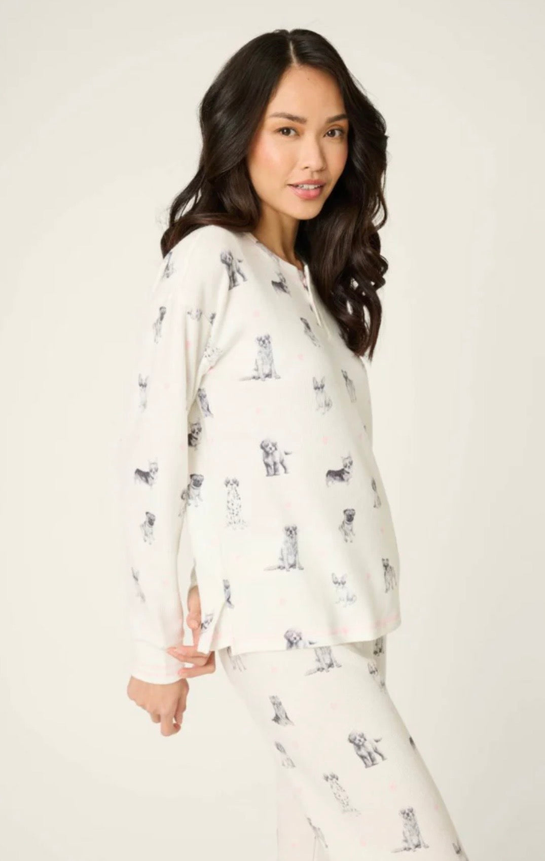 - Henley Top: Classic button placket neckline in white with charming dog and heart print