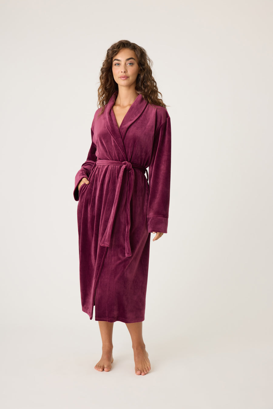 Wrap yourself in luxurious comfort with our cozy robe, crafted from sumptuous velvety velour. This rich, cozy robe features a self-belt for a customizable fit and comfy patch pockets for added convenience. The longer 3/4 length ensures you stay snug from head to toe, making it perfect for lounging or unwinding after a long day. Embrace the ultimate in warmth and luxe comfort and wrap up in a hug of velvety softness and festive charm!