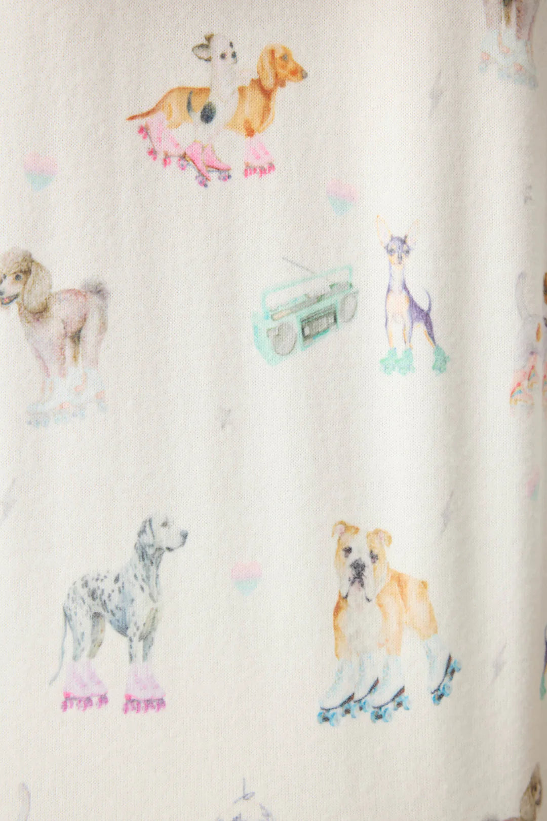 Join the pack and cruise into comfort with these ivory lounge shorts printed with rollerskating pups that keep the good times rolling. Crafted from heavy peachy jersey, they feature a relaxed fit, a pastel-striped waistband, and a drawstring detailed with candy-colored threads—perfect for laid-back afternoons or starlit nights.