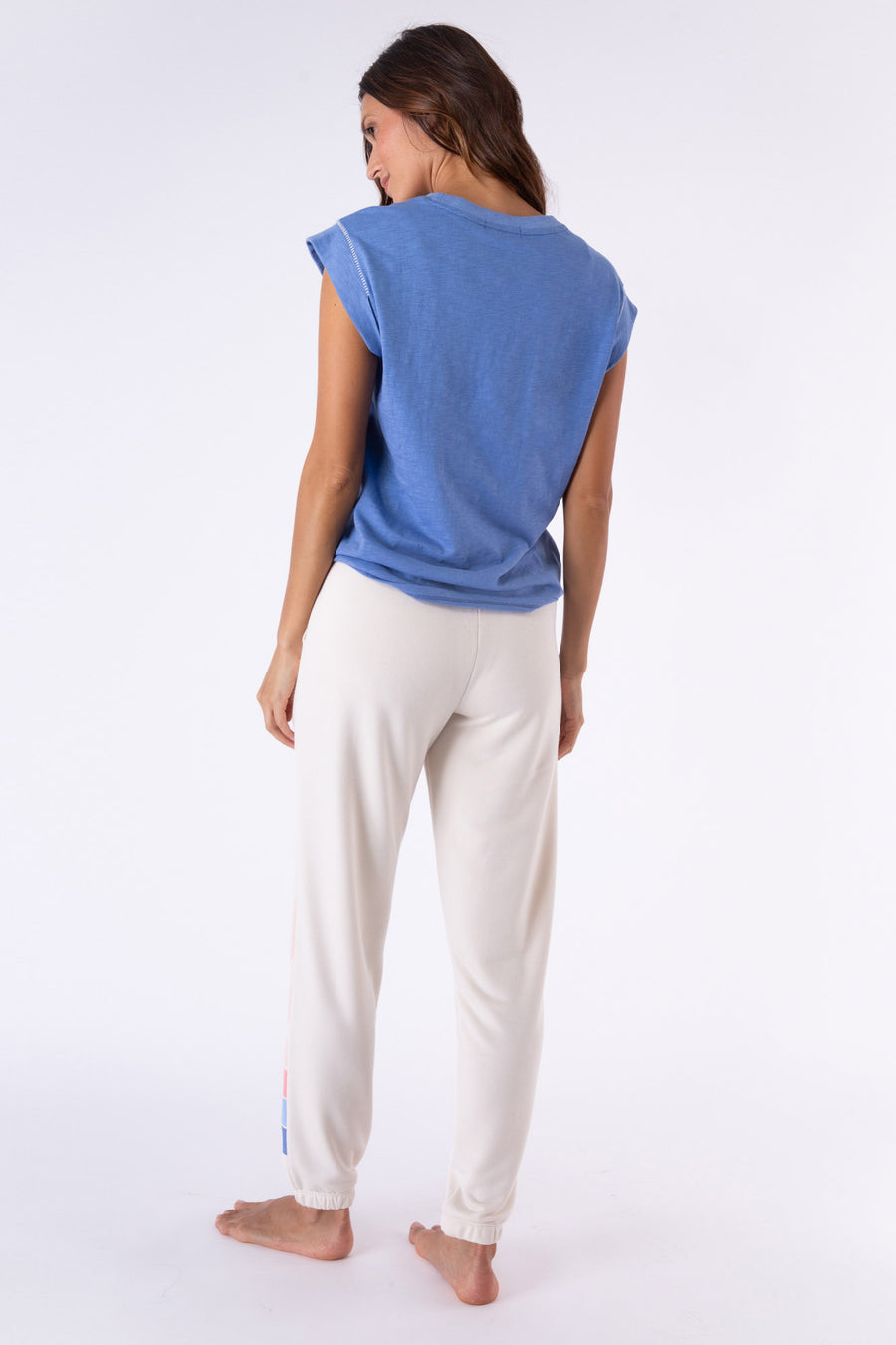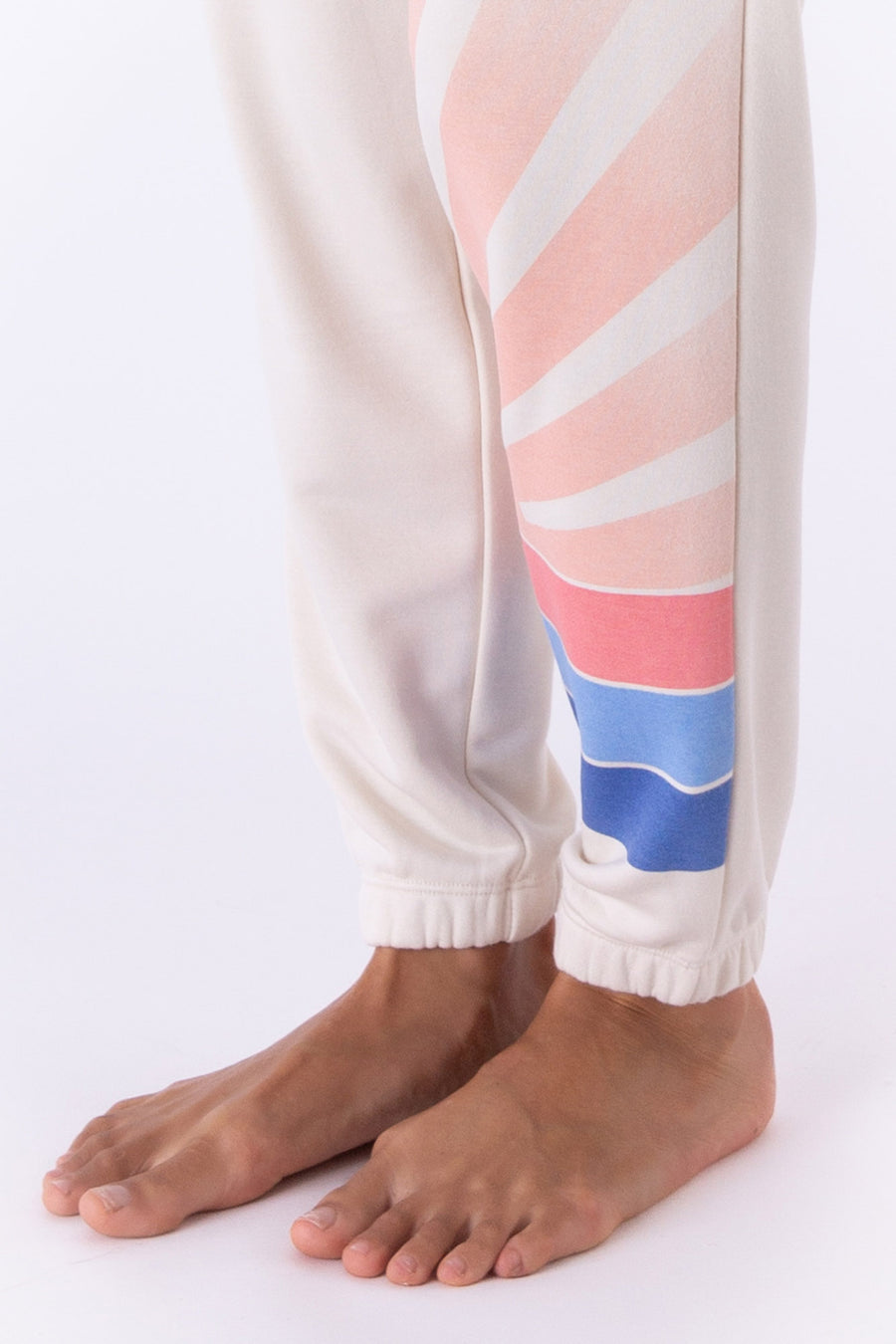 You'll love the asymmetric design of these pull-on pants, with a banded stripe pattern and sunrise motif printed on the base of the left leg. Each elastic waistband also features a drawstring with a striped cord that features the same colorful design.