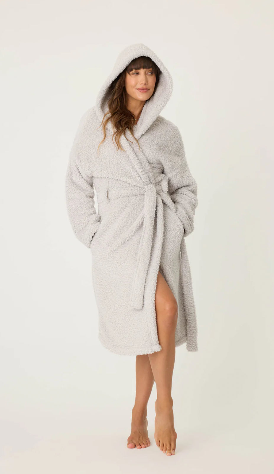 Wrap yourself in luxurious warmth with our grey faux fur robe, featuring front pockets and a tie waist for added comfort. Made from irresistibly soft curly faux fur, this winter robe is softer than your favorite teddy bear, making it the perfect companion for chilly nights. Whether you're enjoying a quiet morning or winding down after a long day, this robe adds a touch of elegance and cozy charm to your winter lounging experience.