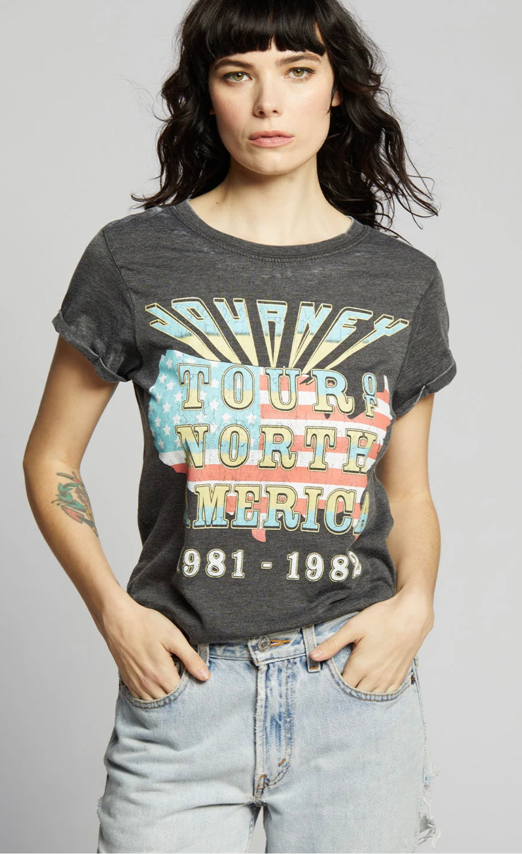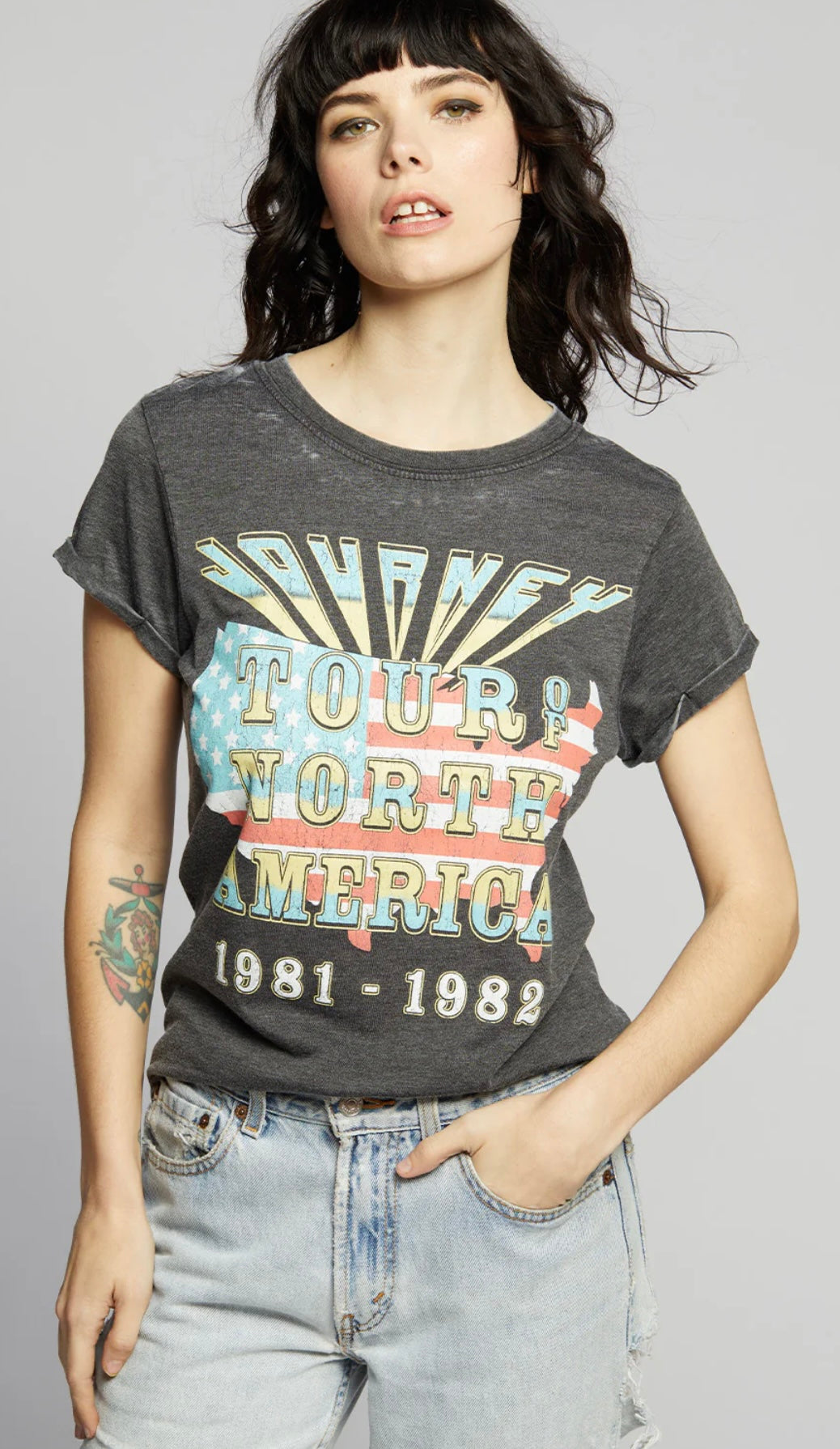 Step into the spotlight with our Journey North American Tour Tee, a vintage-inspired gem that brings back the classic essence of arena rock. Featuring the original "Journey Tour of North America 1981-1982" graphic on the front, this iconic tee delivers that effortlessly cool, lived-in look that never goes out of style. Made with soft cotton fabric, sewn rolled up short sleeves, a ribbed crewneck collar, and a fitted silhouette.