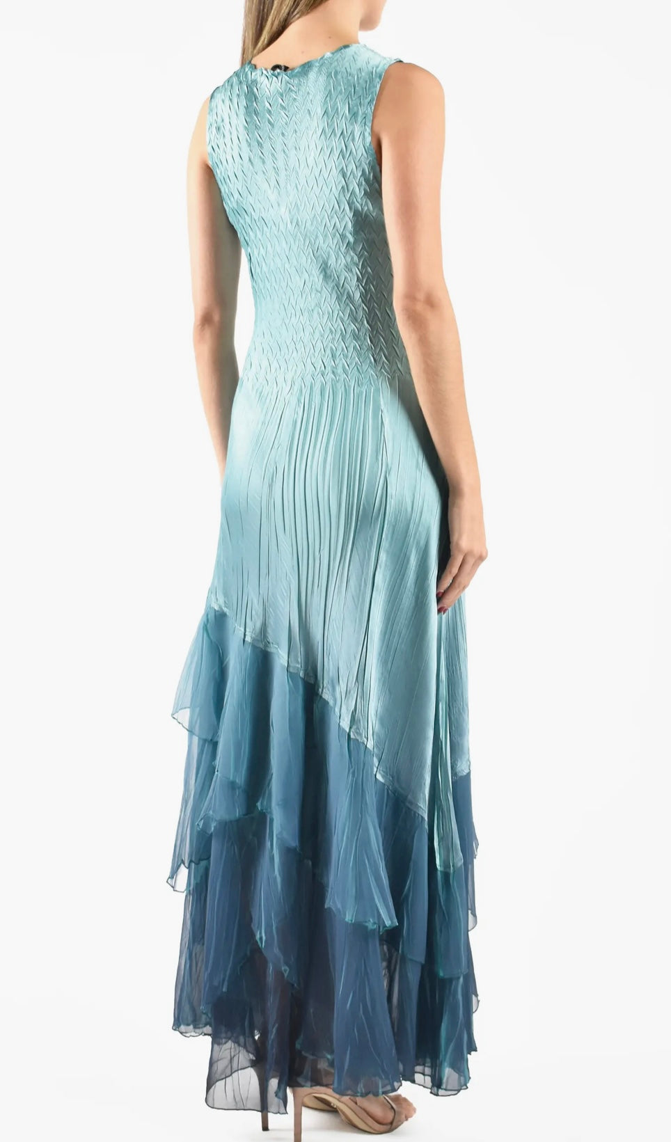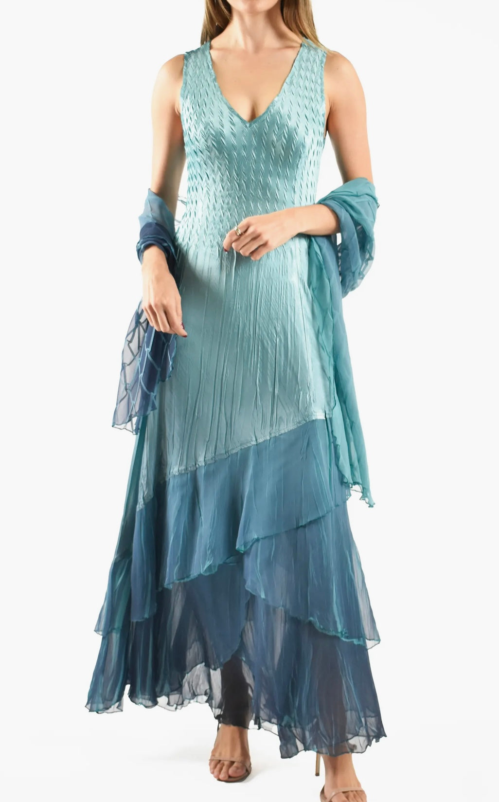 From suitcase to sensational entrance, this wrinkle-resistant combo of charmeuse and chiffon is cut into a tiered cocktail dress that will never show its mileage. It's paired with a fluttery shawl to complete your look.