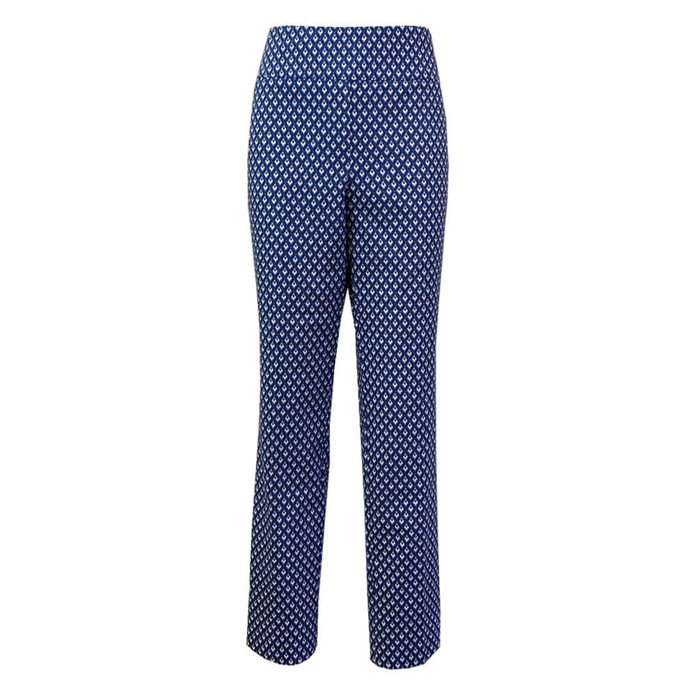 Get comfortable in this UP! Ankle Pant in Blue Peacock. This trouser features women’s body-shaping, slip-on elastic waistband (2 ¾”), built-in hip + tummy control, slim fit, angled front pockets, ankle length, Inseam: 28″, mid-rise. This trouser is made of 52% Nylon, 37% Rayon,11% Elastane. Turn inside out, machine wash cold, gentle cycle, do not bleach, lay flat to dry, iron low on reverse if needed.