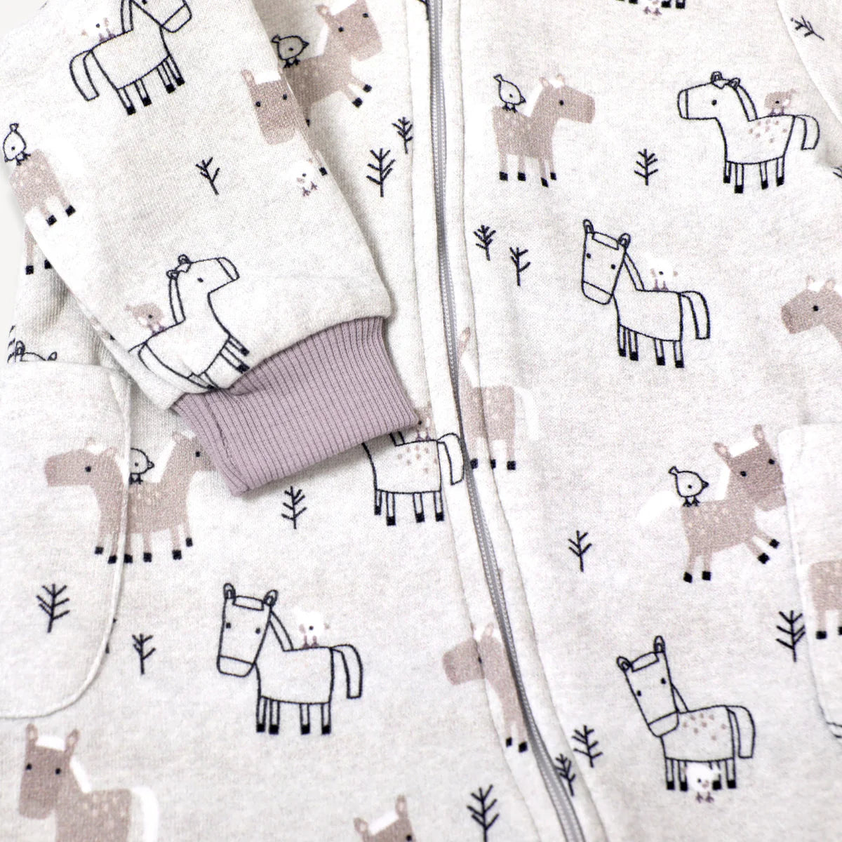 Stay cozy in this soft baby jumpsuit coverall in pure organic cotton with fun and whimsical Horse & Bird print.
