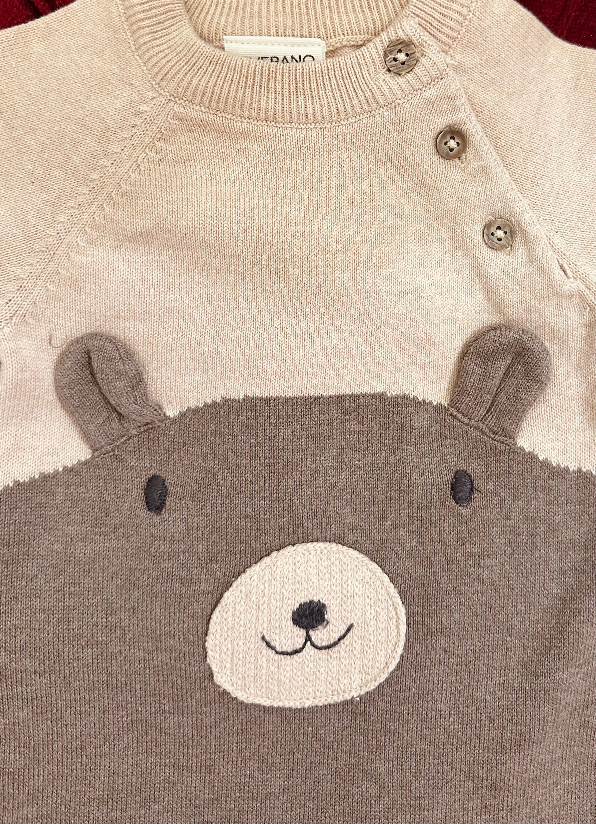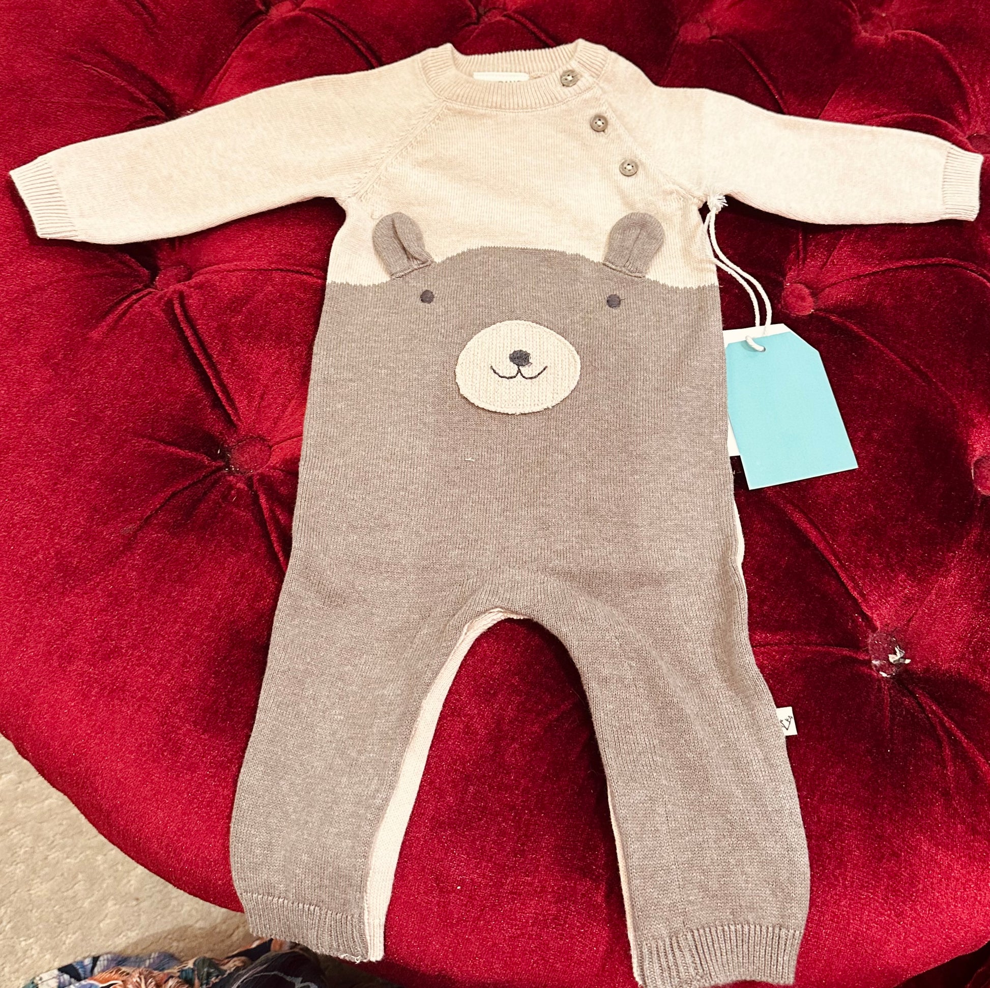 Organic cotton knit baby jumpsuit with adorable bear face embroidery in the front.