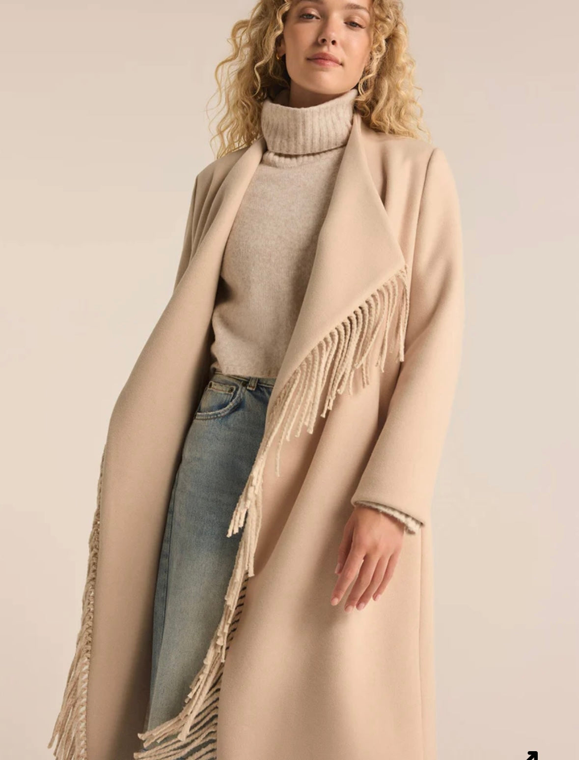 Wrap yourself in cozy luxury with this fringe coat, made from dense pile melton fabric for a plush, cushioned feel. Featuring a shawl collar and open front with playful fringe accents, it’s the perfect midweight layer for adding texture and warmth to your fall wardrobe.